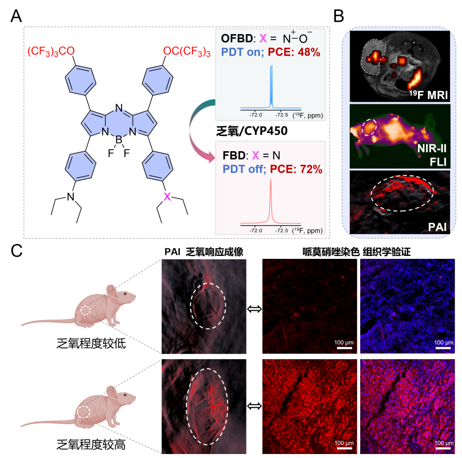 Recently, the research team from the Innovation Academy for Precision Measurement Science and Technology (APM) has made new progress in the field of multimodal imaging. The research team constructed a hypoxia-responsive multimodal imaging system by fluorinating and modifying the photosensitive molecule aza-BODIPY and employing a fluorophilicity-driven co-assembly strategy in fluorinated oil. This system integrates fluorine-19 magnetic resonance imaging (¹⁹F MRI), near-infrared second-window fluorescence imaging (NIR-II FLI), and photoacoustic imaging (PAI), providing a new solution for precise imaging of deep-seated tumors. The findings were recently published in Advanced Science.