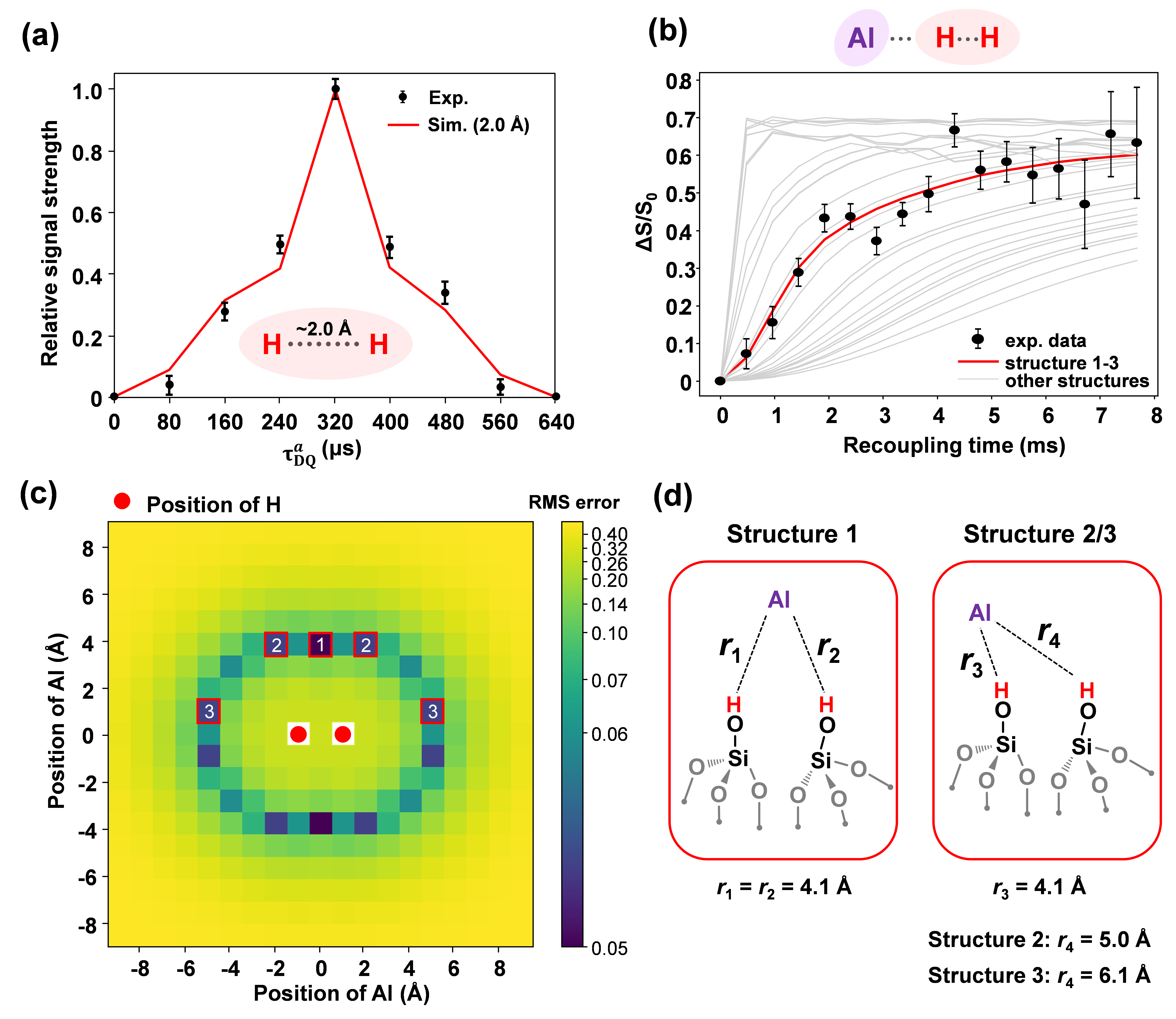Figure 2. Measurement of the inter-nuclear distance of "pseudo-bridging hydroxyl pairs" in hydrothermal-treated ASA catalysts; (a) Constant-time evolution 1H-1H f-DQ/SQ experiments and fitting; (b) 1H-{27Al} S-RESPDOR experiments and fitting; (c) Root-mean-square error between the experimental data of 1H-{27Al} S-RESPDOR and the results of spin dynamics simulations; (d) Two most likely structural models of pseudo-bridging hydroxyl pairs proposed based on NMR/DFT results