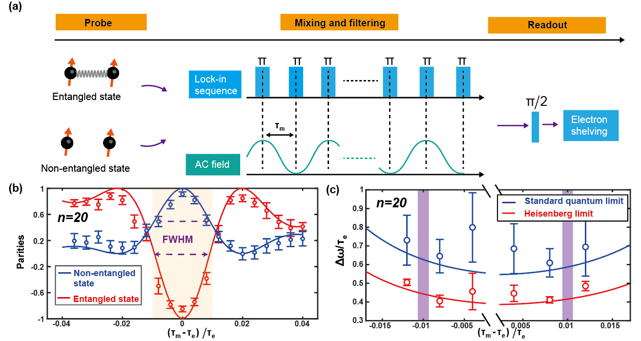 Schematic diagram of the principle of entanglement-enhanced quantum lock-in detection. (a) Experimental timing sequence from probe initialization to final detection; (b) Parity depending on the pulse period for entangled states (red) and non-entangled states (blue); (c) Comparison of measurement accuracy between entangled states (red) and non-entangled states (blue), showing that entangled states approach the Heisenberg limit.