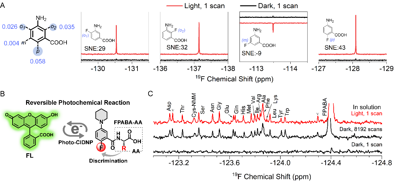 (A) The spin density and polarization performance of 19F at different positions of monofluorinated aminobenzoic acids; (B) Detection mechanism via the photo-CIDNP enhanced 19F probe.; (C) The 19F NMR spectrum of a 1 μM amino acid mixture